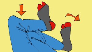 これを、一人で行う場合には、倒した側の脚を反対の膝に乗せて軽く組みます。そして倒した側の脚が、倒れやすい側に戻ろうとするのをストップ。あとは、2人組で行うのと同じにすれば、全く同じ感覚を得ることができます。また、両手はアバラ骨に軽くおくと胸椎を意識しやすくなります。